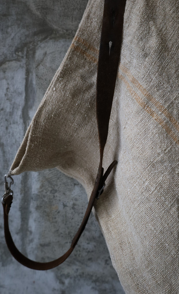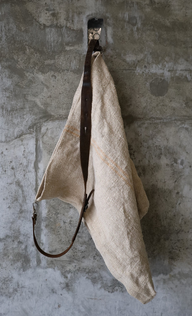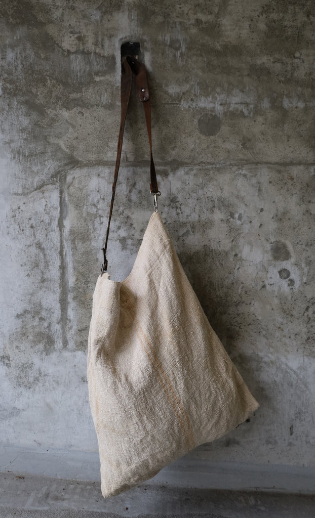 Large Vintage Hand-Woven Hemp Canvas Bag, with Oiled Vintage Leather Straps and Metal Hooks.