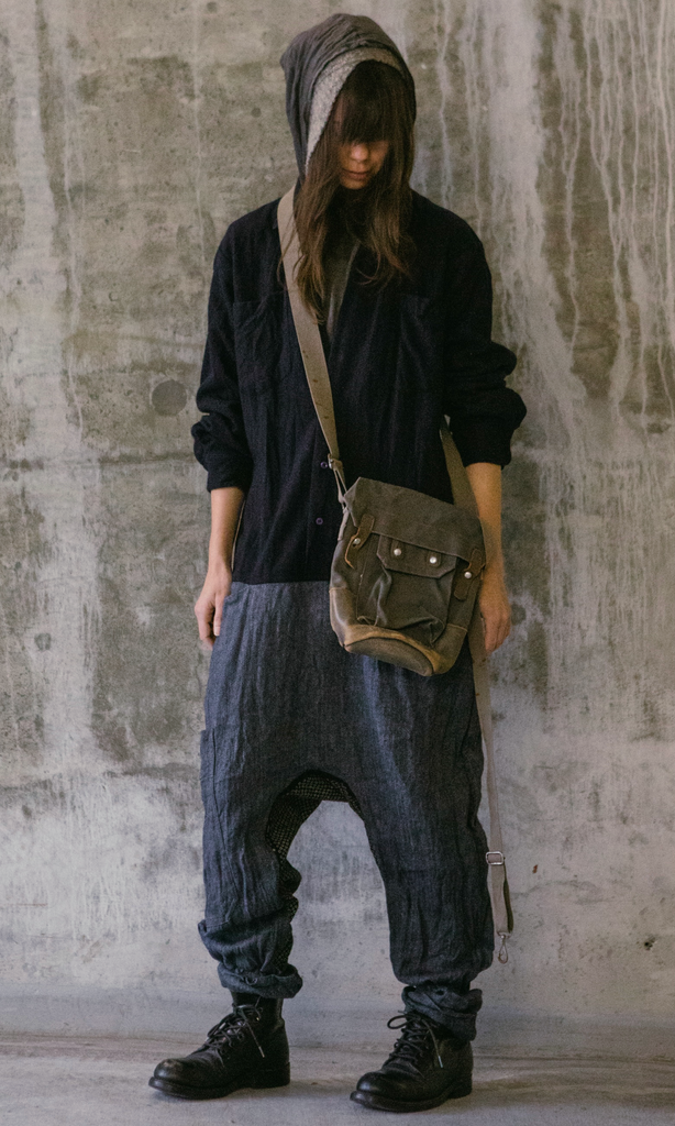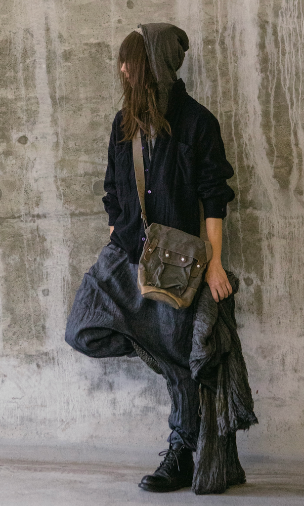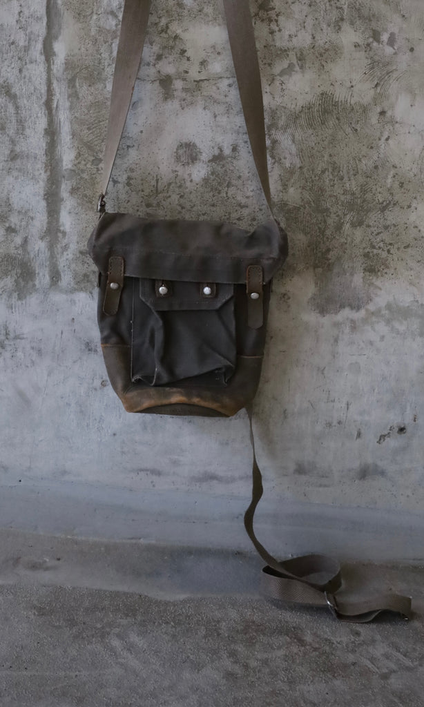 Vintage olive colored canvas bag, with outside pocket and adjustable strap.