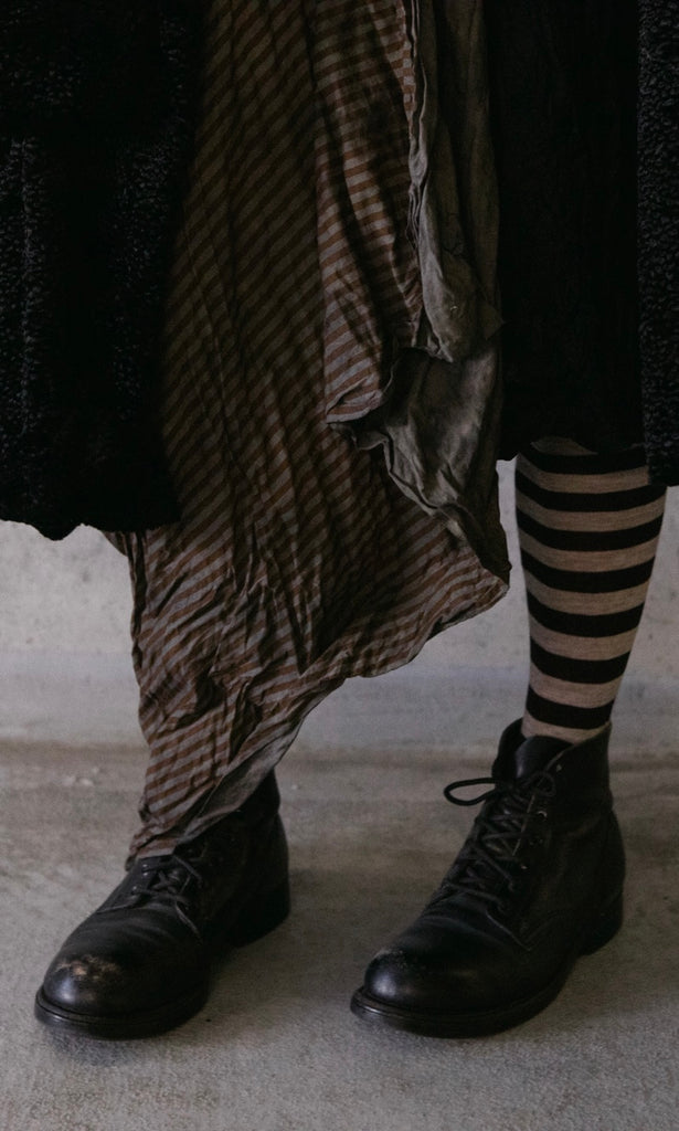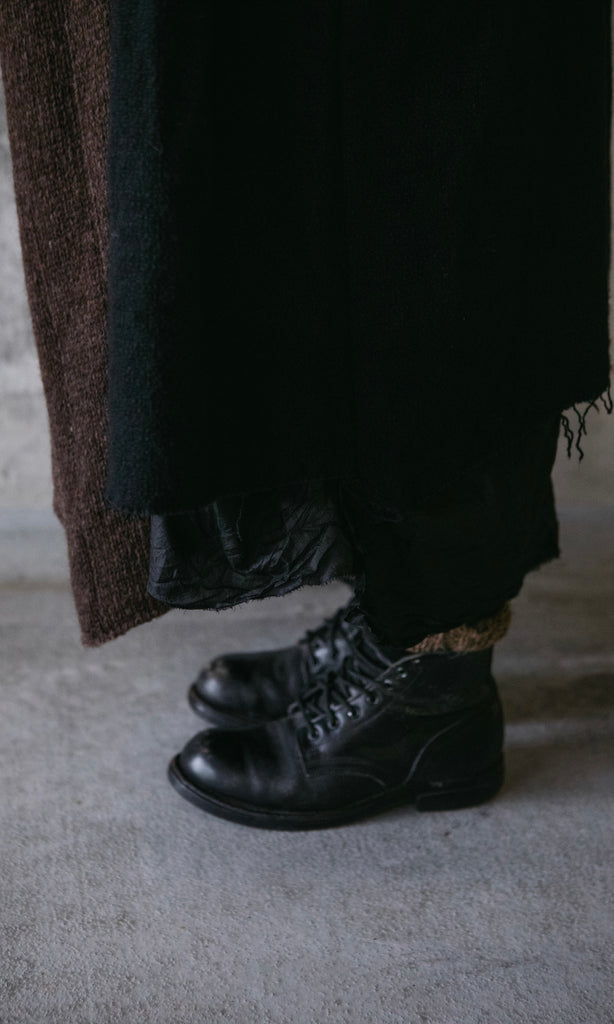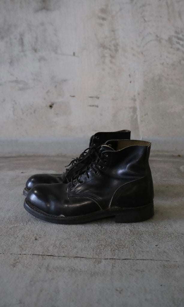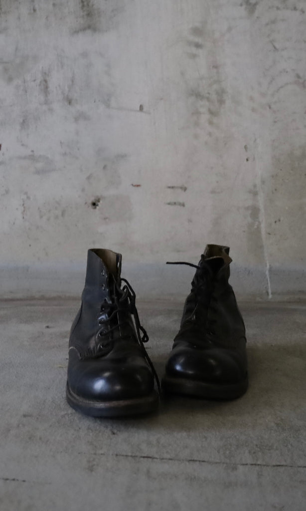 Vintage steel toe combat boots, each with distinct markings from wear.