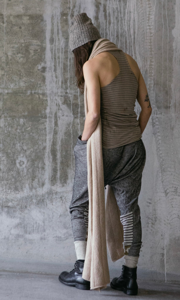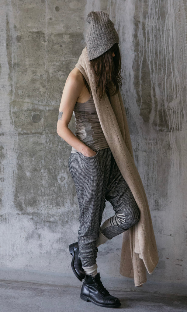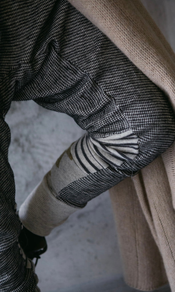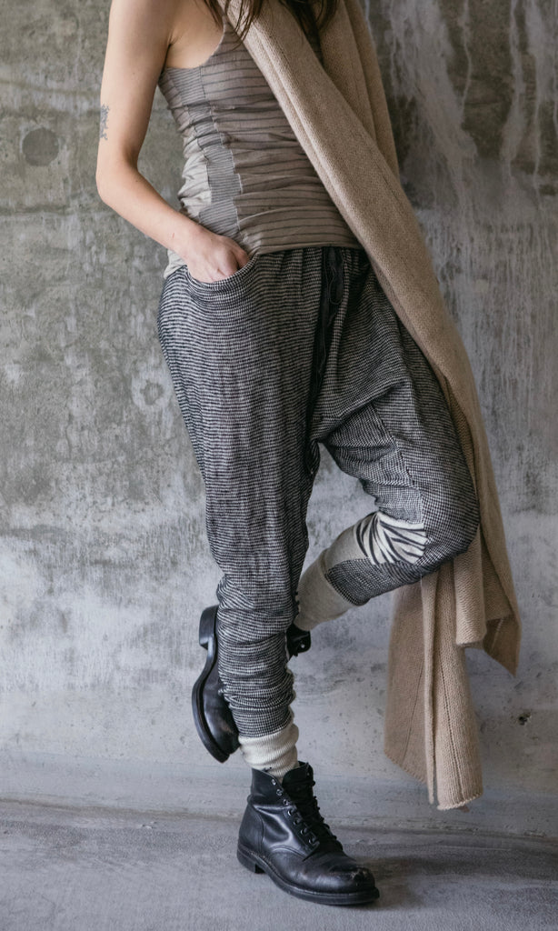 Houndstooth knit trousers made of Japanese wool cashmere, featuring low inseam that tapers to the bottom with a vintage cashmere insert. Adjustable drawstring waistband, ribbed cuffs and inserted side pockets.