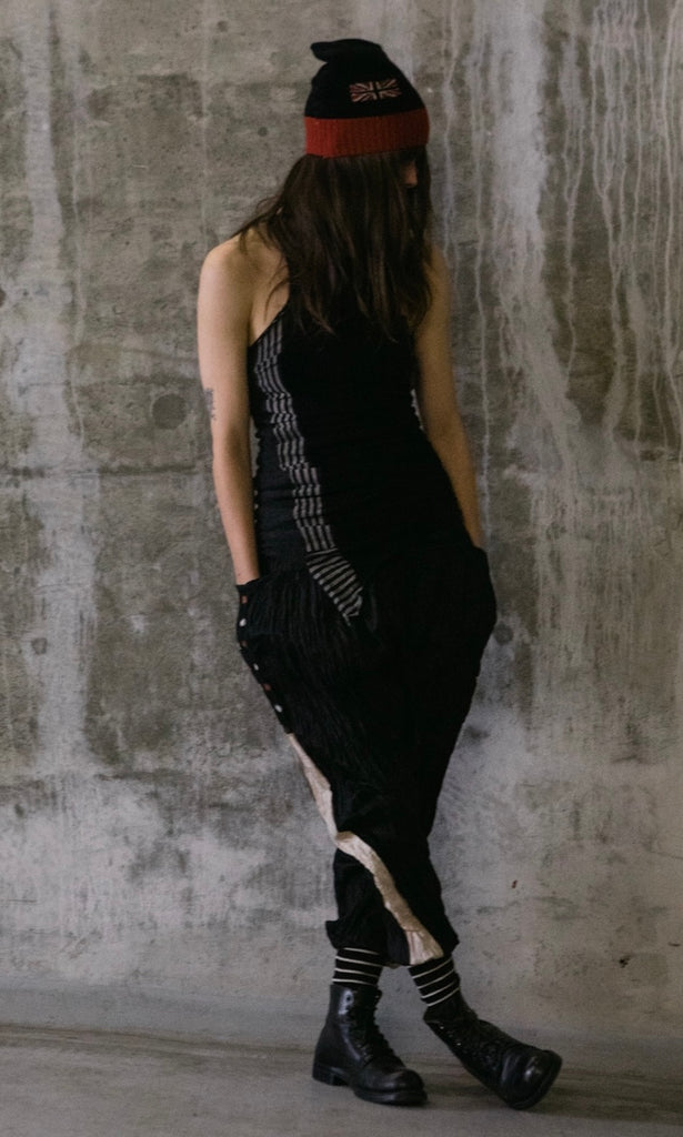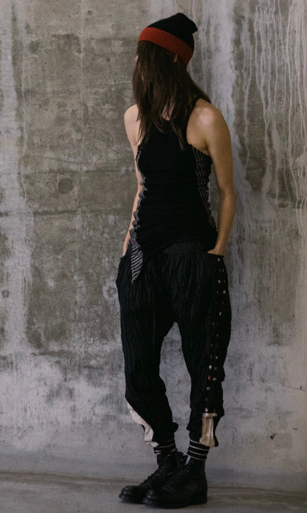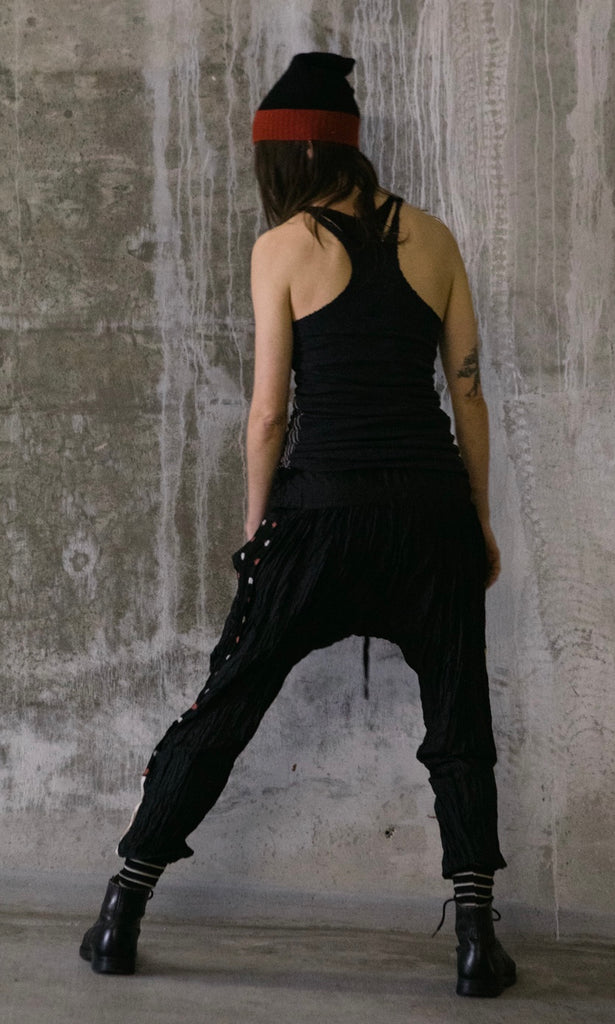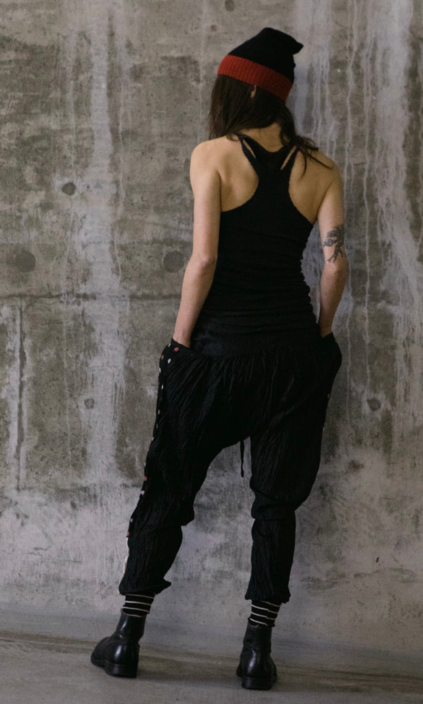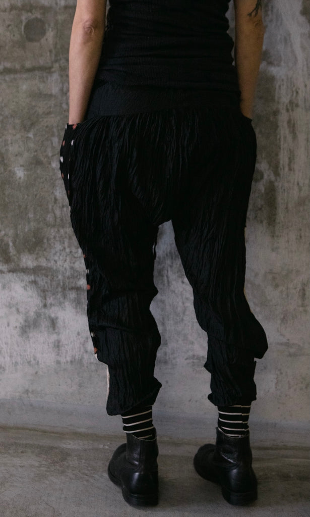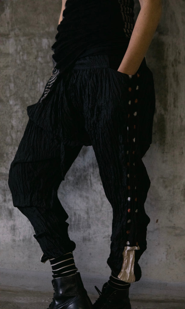 Loose fit pants that taper to the cuff. Made of crinkled silk with vintage Japanese kimono panels along the sides and cotton rib ankle cuffs.