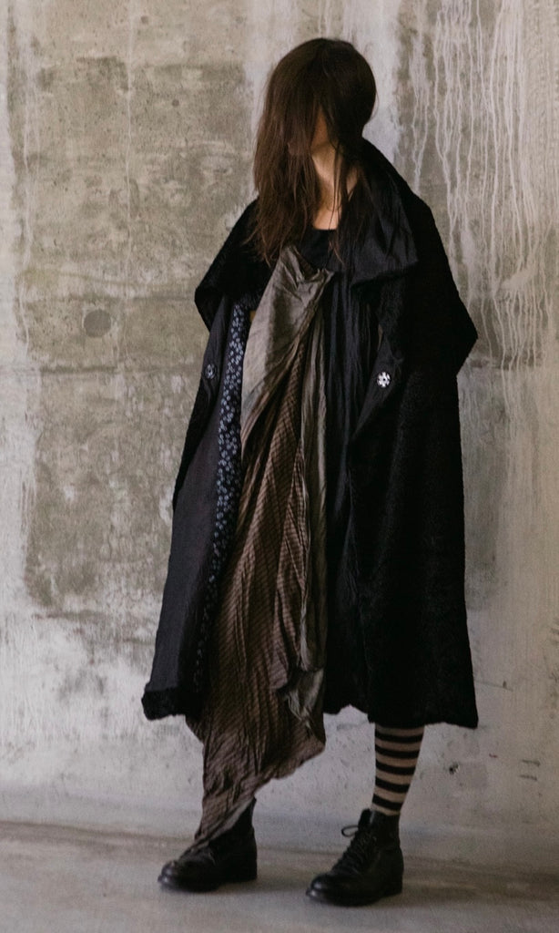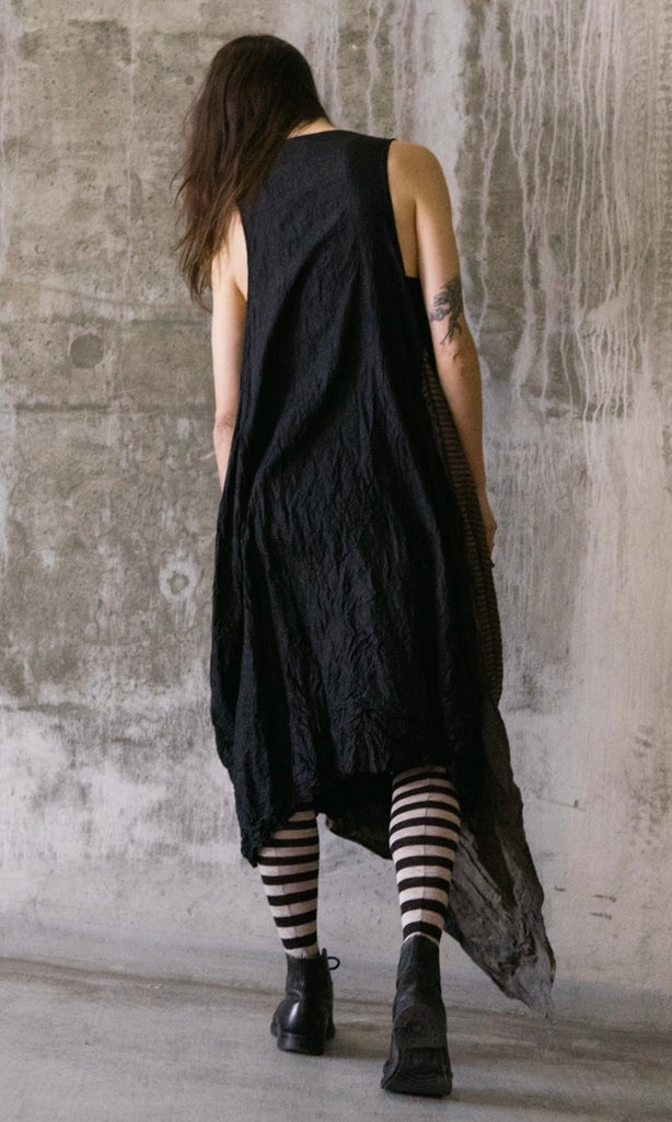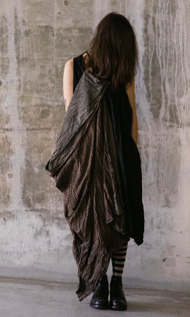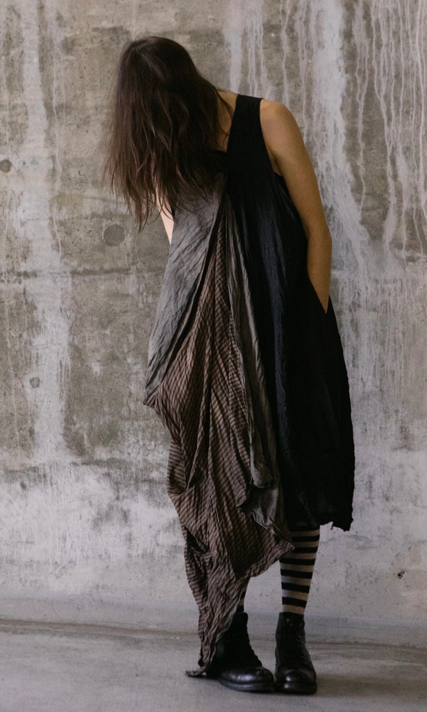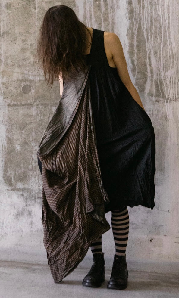 Black crinkled silk dress with a hand stitched, hand-dyed cotton panel at the front. Featuring a draped silhouette and asymmetric bottom.