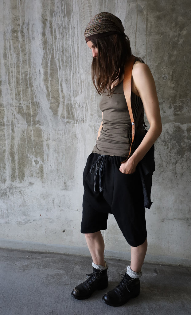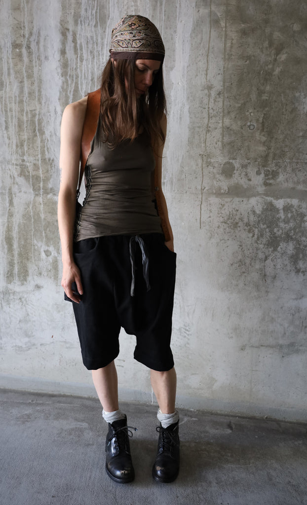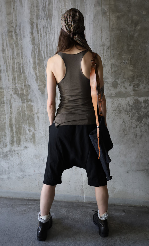 Army Green Cotton/Tencel singlet with raw cut edges and a racer back, featuring striped, hand-dyed cotton panels, inserted on the sides. Made in Canada