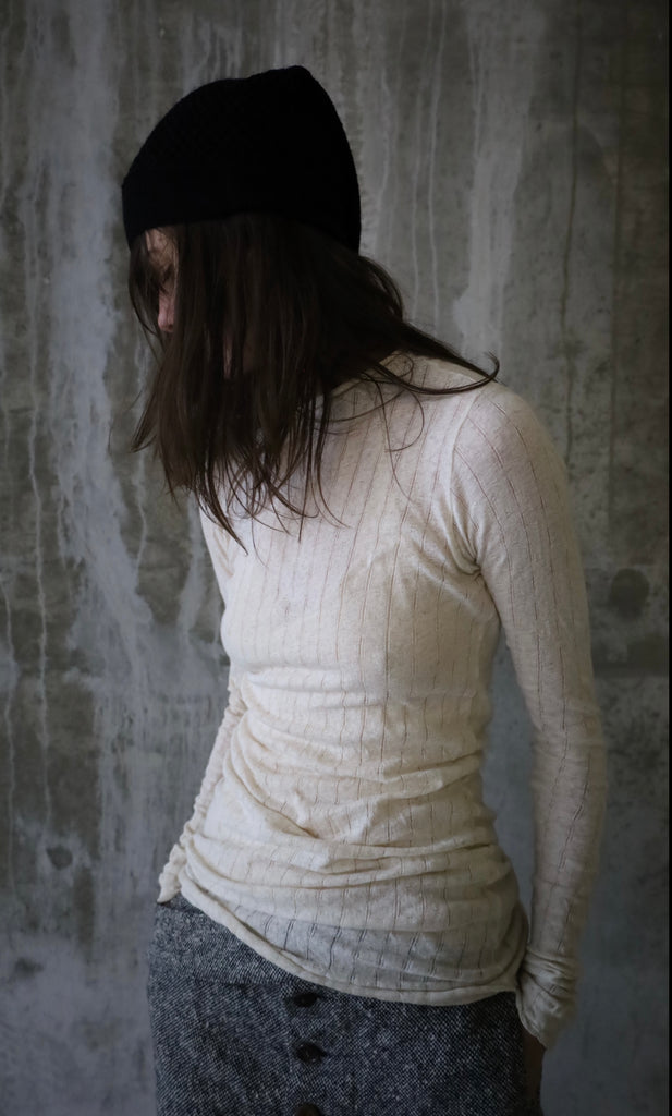 Long sleeve top made of 100% organic cotton, sheer finish resembling antique French lace. Fitted silhouette.