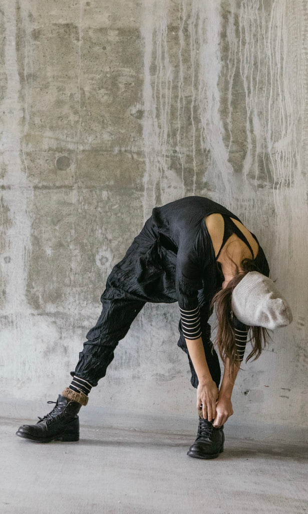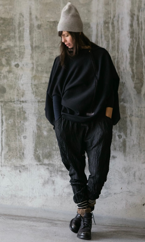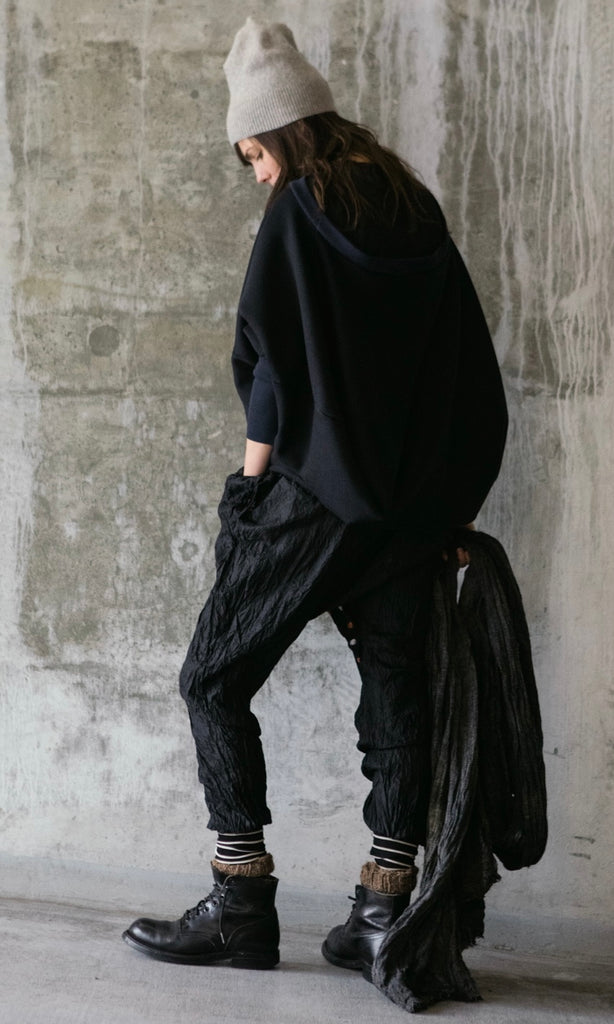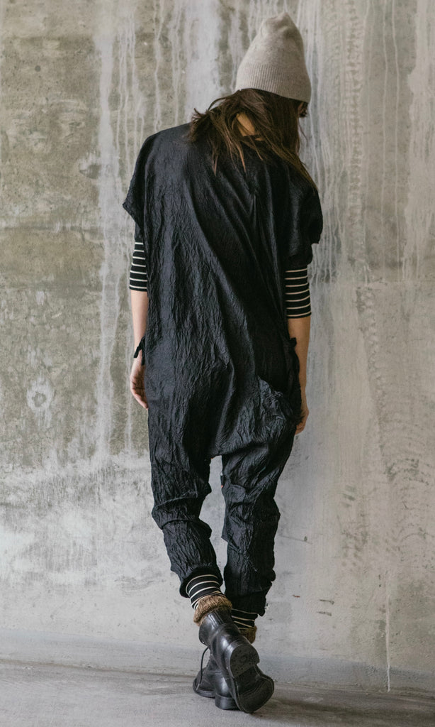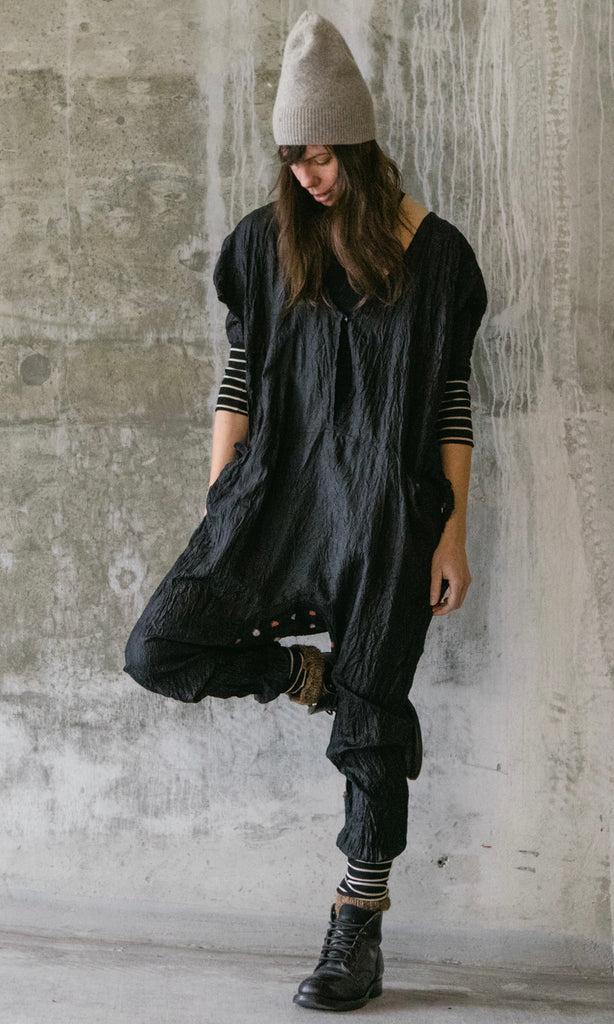 Hand crinkled silk onesie with vintage Japanese kimono insert at the inseam. Open sides with striped tencel rib cuffs and a large side back pocket.