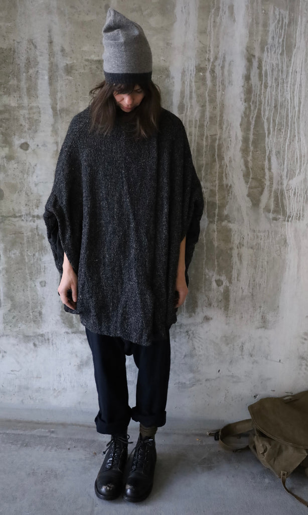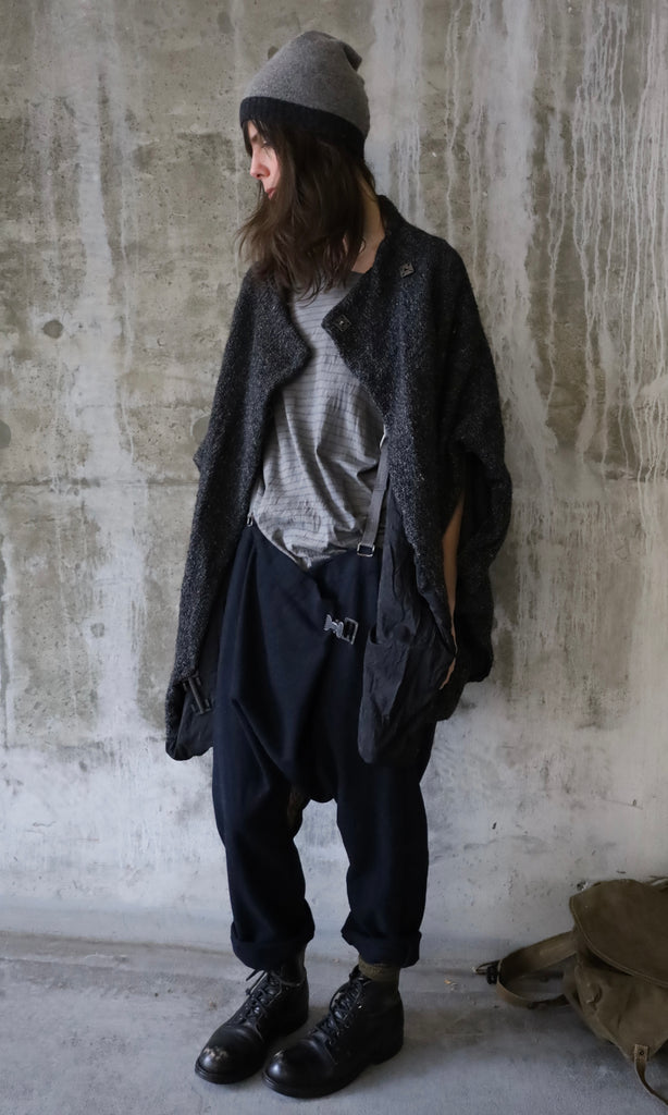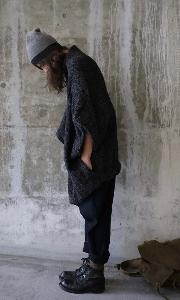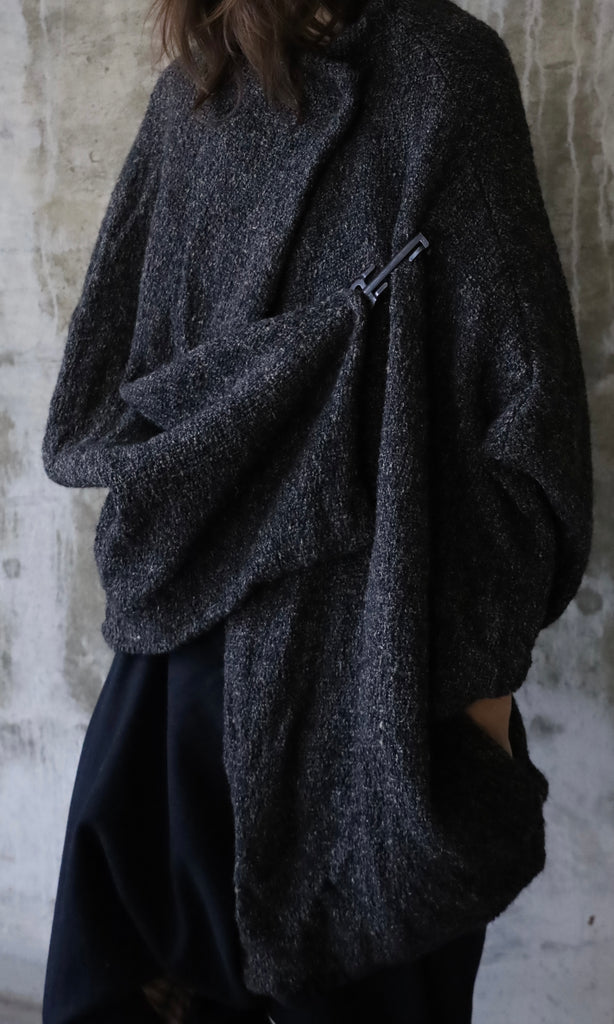Draped drop shoulder coat, made of loose weave wool with a black crinkled silk lining. Front features two closures for versatile wear: a snap at the collar and a vintage metal hook that fastens where the wearer prefers.