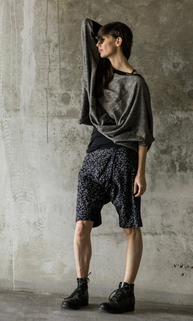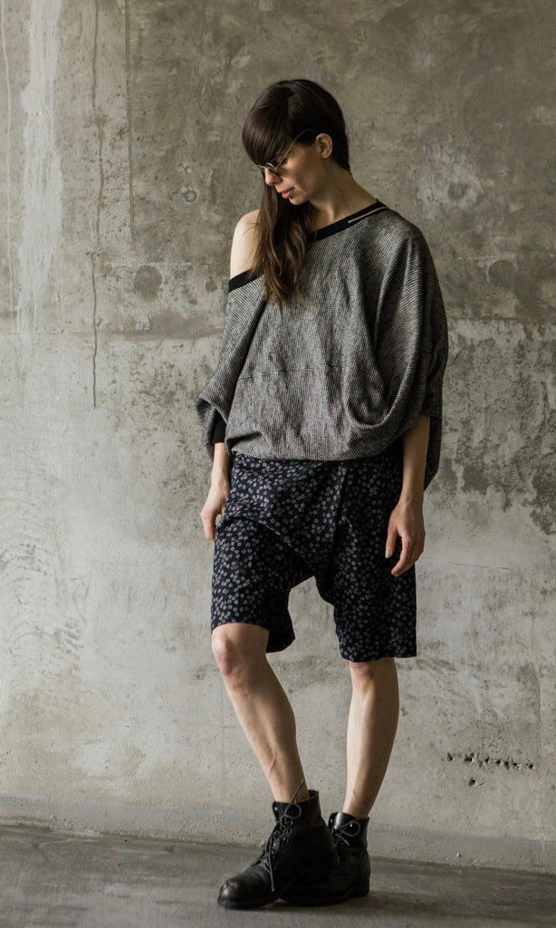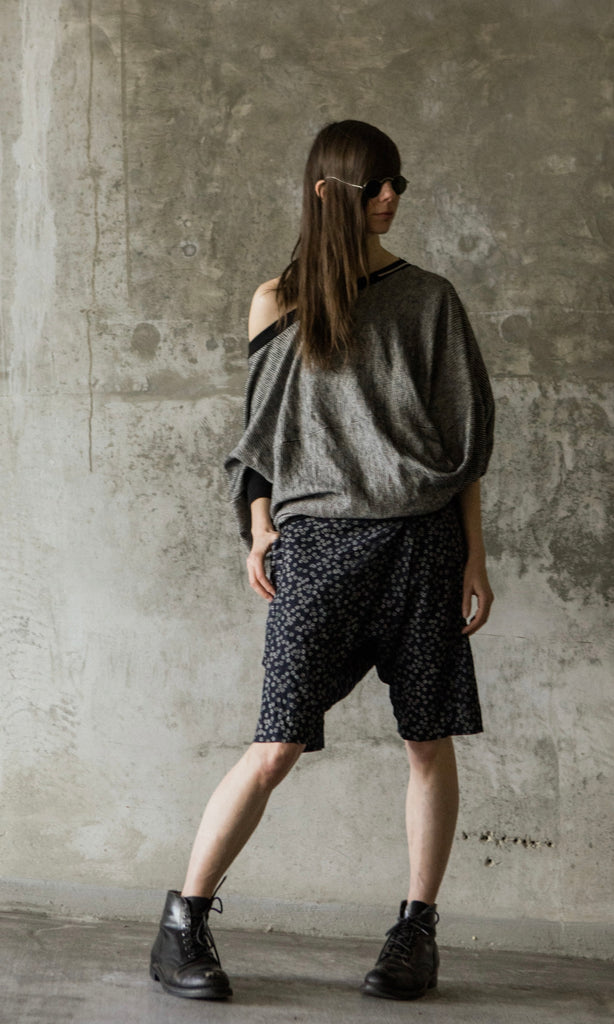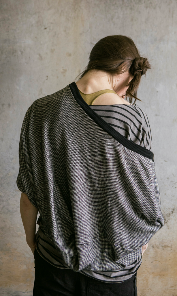 Houndstooth knit sweater made of Japanese wool cashmere, featuring ¾ cotton ribbed sleeves and a dropped neckline.